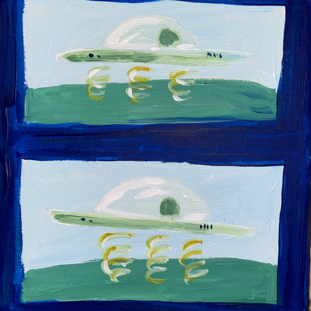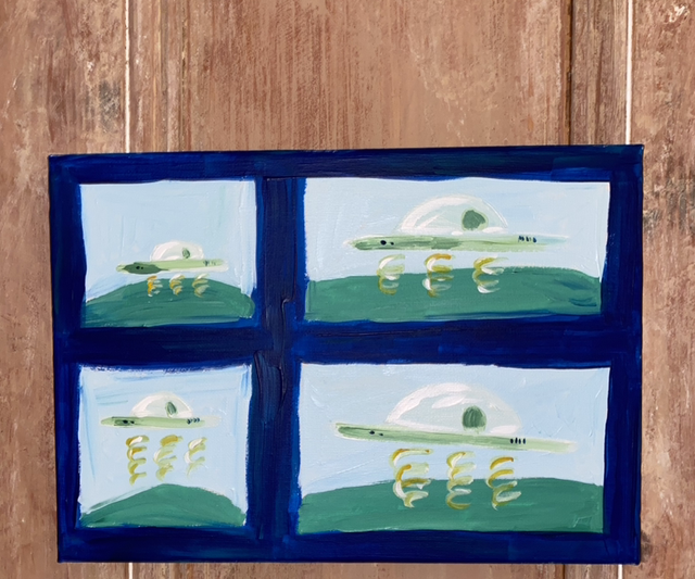 A vehicle lands in a field. It’s a spaceship and an alien has come to take in the view.